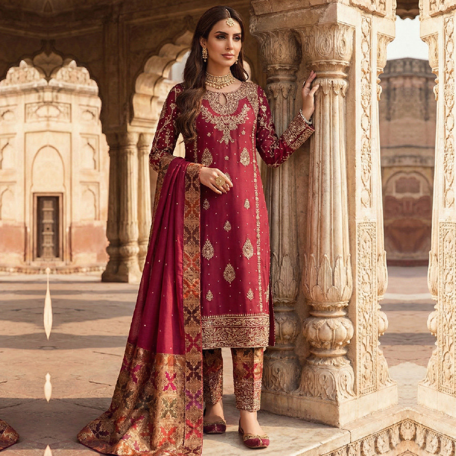 Experience timeless elegance with this beautifully crafted 3-piece unstitched outfit, designed for those who love luxury with tradition.